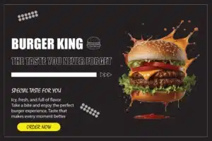 We designed a high-impact promotional brochure for Burger King. Additionally, the single-page layout features a bold dark background with a large, mouth-watering double cheeseburger image, complete with orange sauce splash effects. We included the official Burger King logo, the powerful tagline “THE TASTE YOU NEVER FORGET,” mouth-watering description text, and a bright yellow “ORDER NOW” button. Furthermore, we optimized the design for both digital and print use to drive immediate customer action.