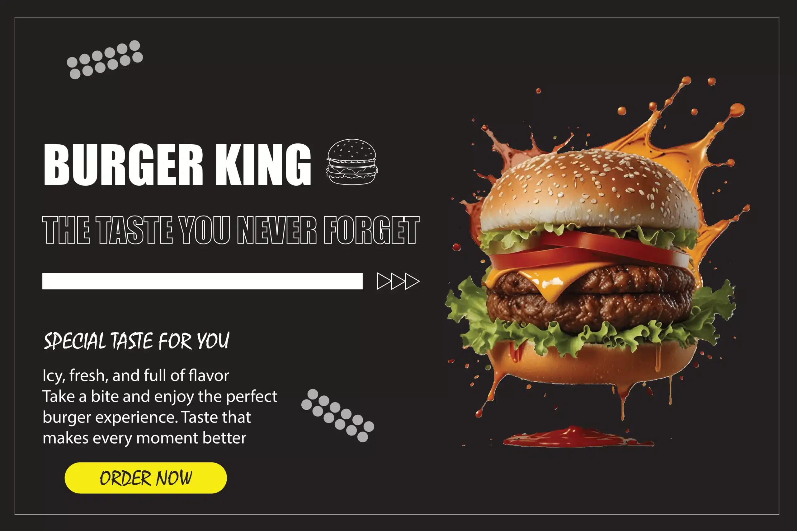 We created a dramatic dark layout to let the burger photography stand out. We added dynamic orange sauce splashes and dripping effects for energy and realism. Bold white typography was used for the headline and tagline while keeping the body text clean and inviting. The yellow “ORDER NOW” button was placed for instant visibility. Every element was carefully positioned to guide the eye from the image straight to the action.