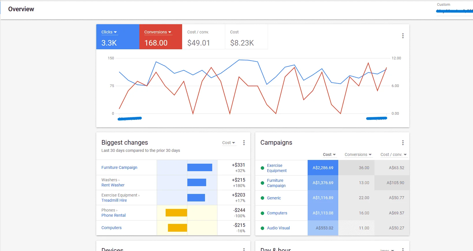 We managed a full Google Ads campaign for an equipment rental business in Australia. Over the reporting period we drove targeted traffic for furniture hire, exercise equipment, washers, computers, phones, and audio-visual rentals. The dashboard shows 3.3K clicks and 168 conversions with an average cost per conversion of $49.01 and total spend of $8.23K. We optimized multiple campaigns in real time to maximize qualified leads and rentals.