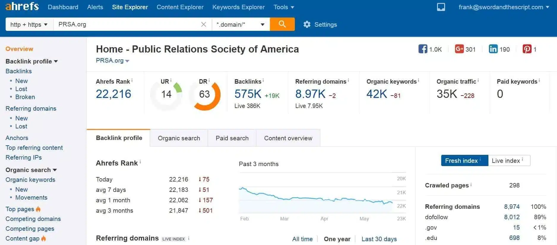 We conducted a complete SEO audit and ongoing monitoring for the Public Relations Society of America (PRSA.org) using Ahrefs. The dashboard shows a strong backlink profile with 575K total backlinks, Domain Rating of 63, and 8.97K referring domains. The site ranks for 42K organic keywords and generates 35K monthly organic traffic. We tracked authority metrics, backlink growth, and organic visibility to maintain the association’s strong position in the PR industry.