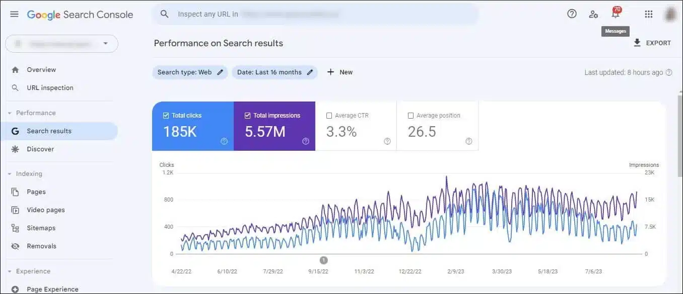 After 16 months the site reached 185K total clicks and 5.57M total impressions. Average CTR improved to 3.3% and average position reached 26.5. The performance graph shows steady upward growth in both clicks and impressions with clear seasonal peaks. The client now has strong, sustainable organic traffic that continues to grow every month without paid advertising.